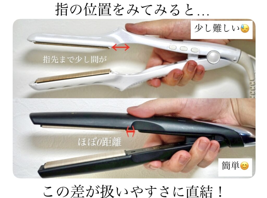 例えるなら、手で小豆を掴むか、菜箸で一生懸命掴むかくらい違います!持ち手とプレートの距離を限りなく近づけて、まるで自分の指先のように扱える設計になっています。ご自身のアイロンも持った時に見てみてください。意外とプレートまでの距離が遠いなと思いませんか?(KINUJOストレートも距離が近い方ですが、絹女プロはほぼゼロ距離!)