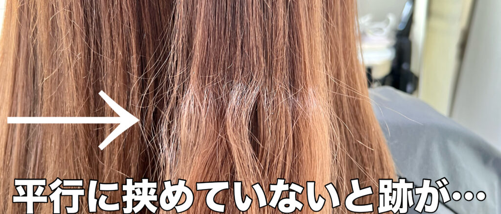 実際にどんなに良いアイロンを使っても、平行に挟めていないとこのような跡がついてしまうんです。