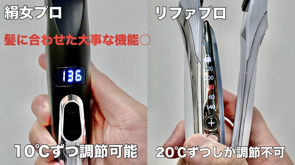 この何℃ずつ刻んで温度が変わるのかは、結構重要で高級ヘアアイロンの部類で20℃刻みでしか温度調節できないのは致命的です。